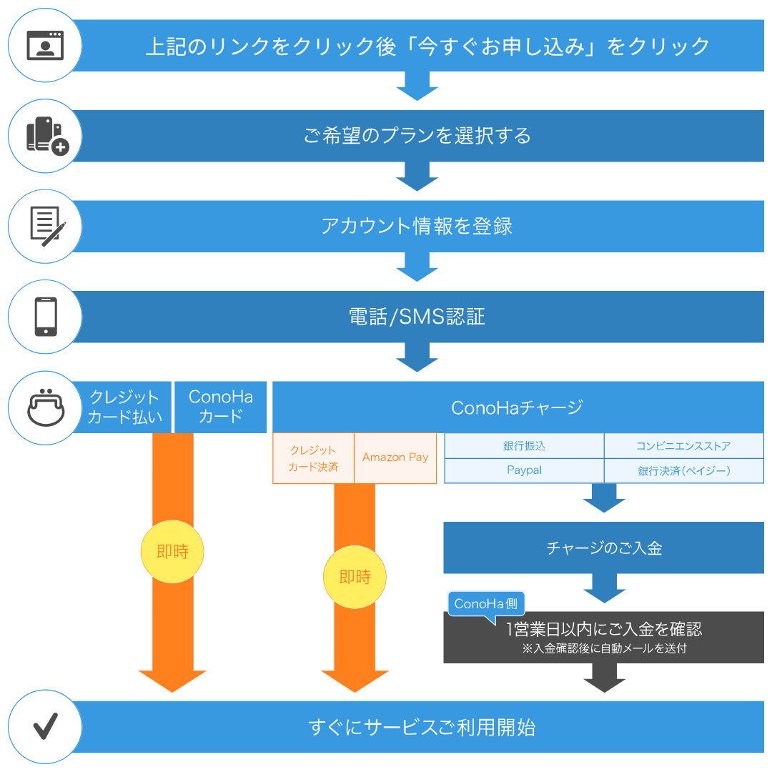 ConoHaサービスのお申し込みはWeb上で全て完結します。さらにお申し込み時にクレジットカード払いまたはAmazon Payを選択された場合、お申し込み後すぐにConoHaサービスをご利用いただけます。